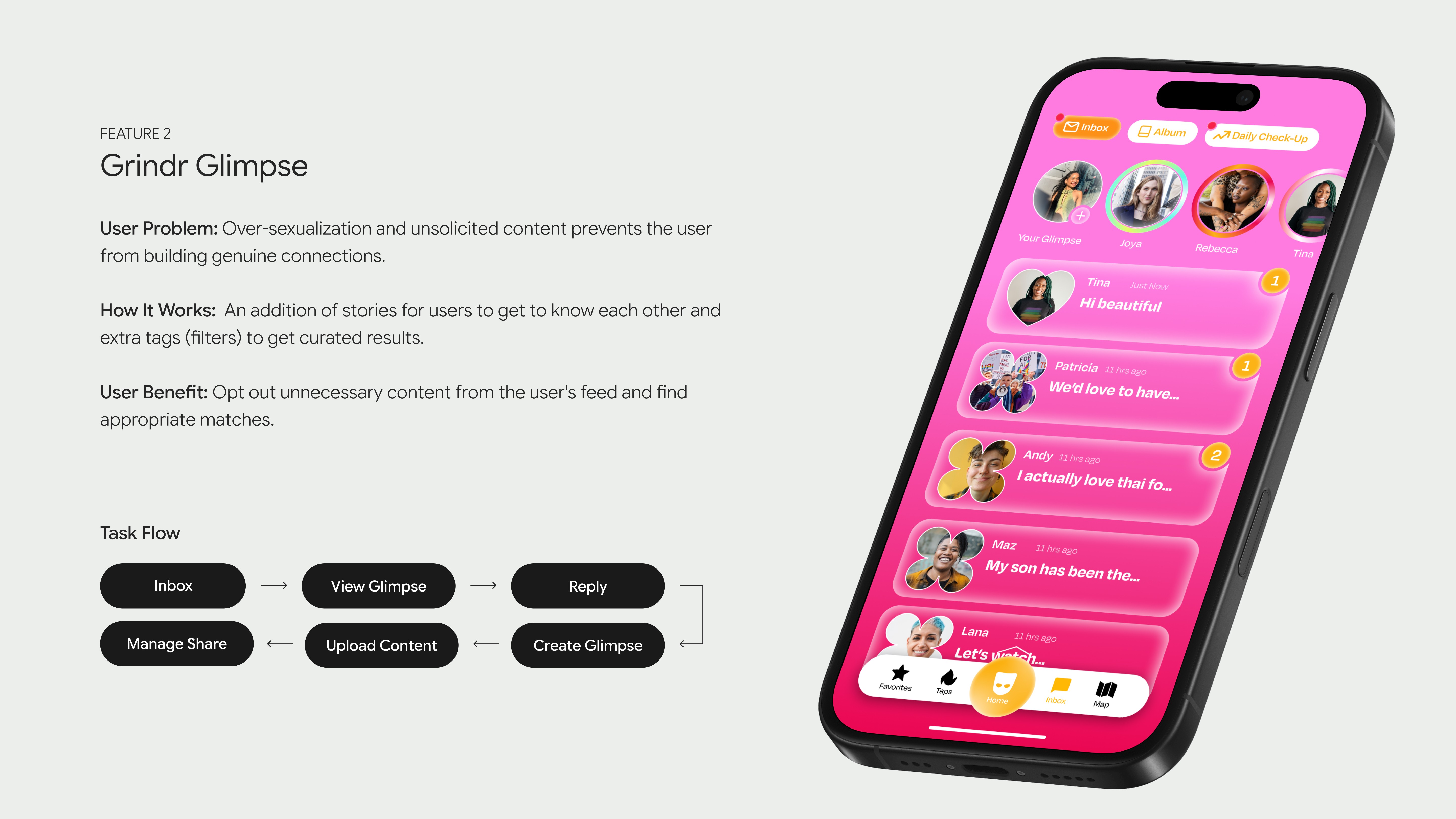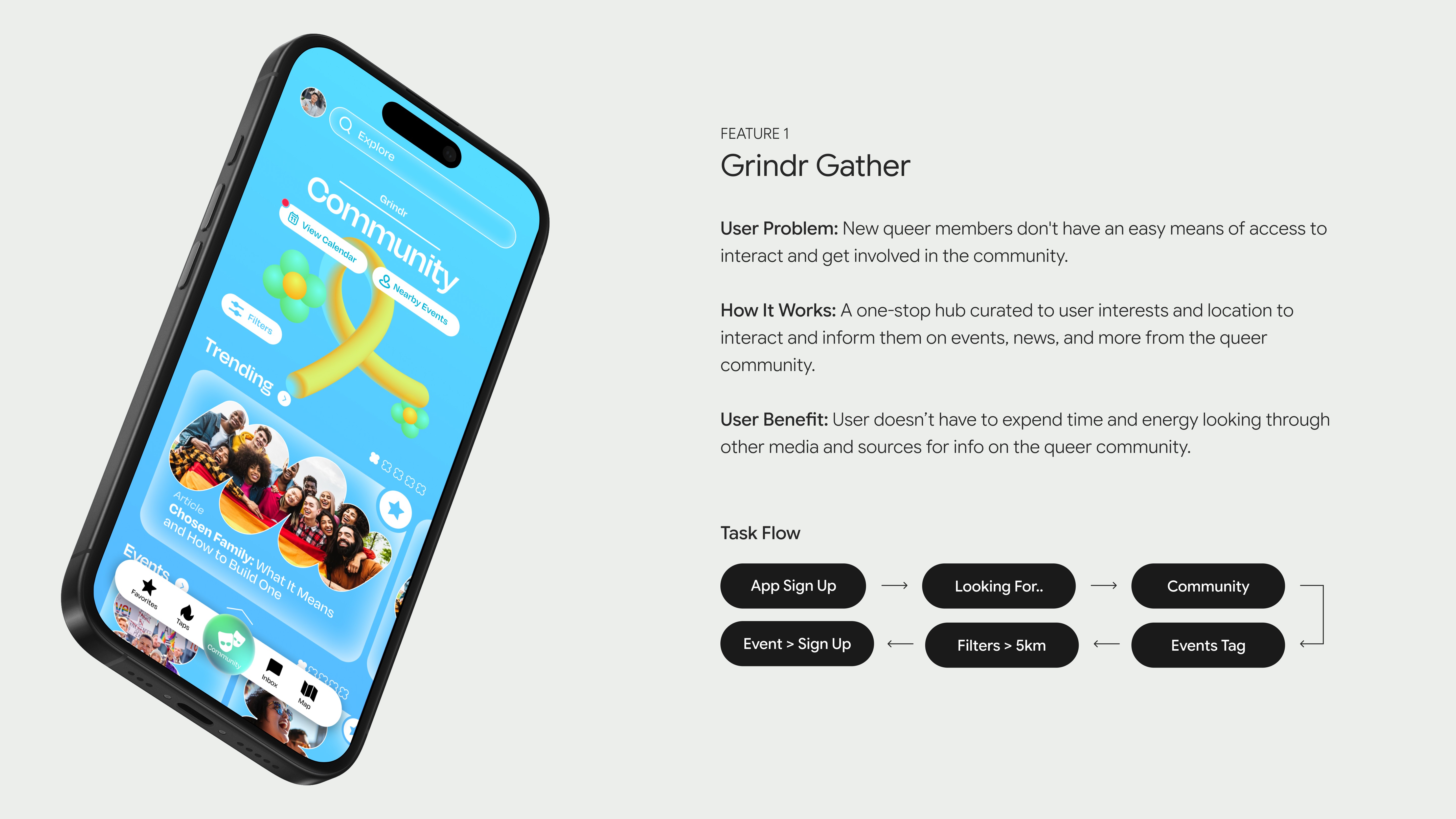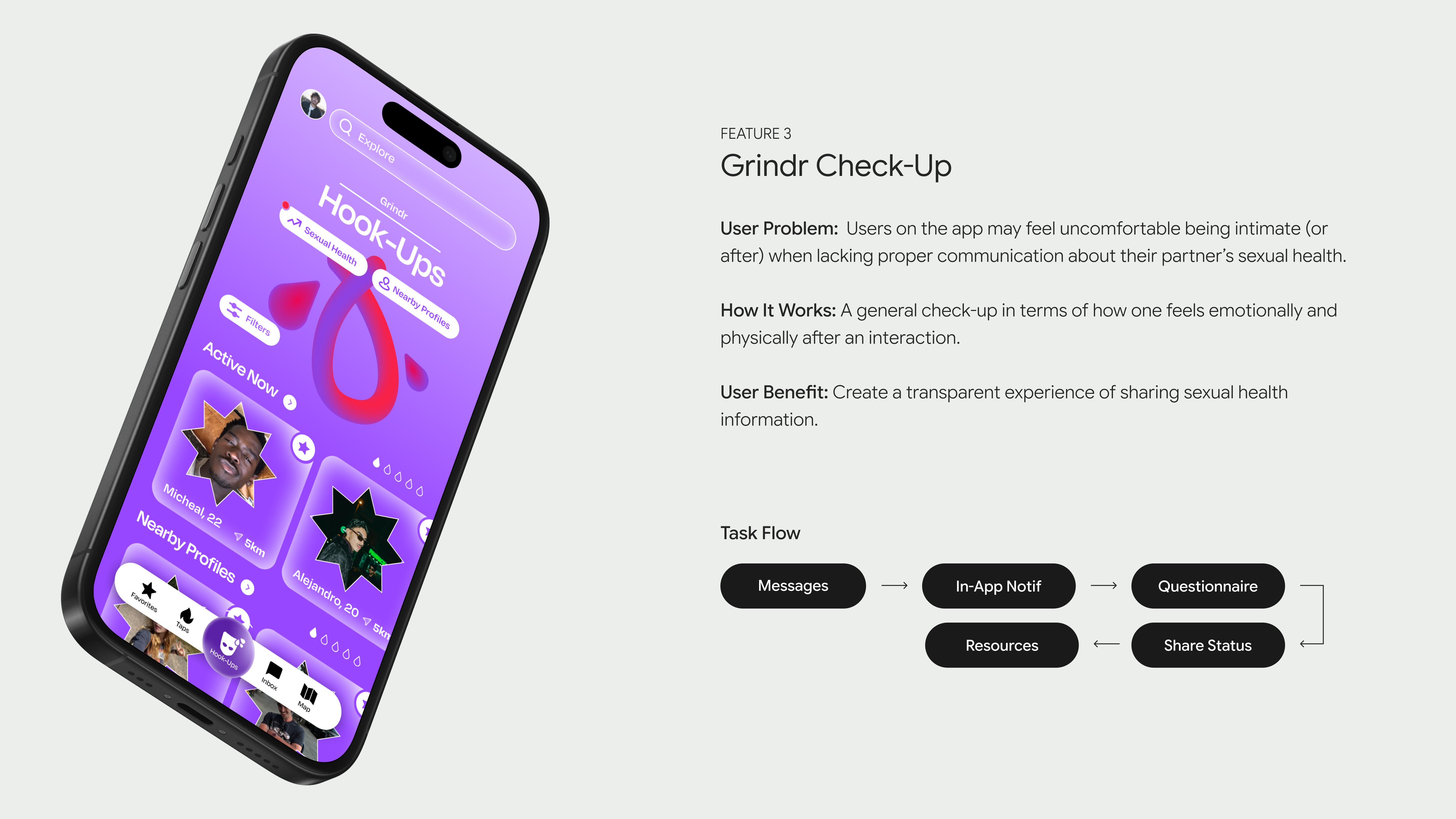 Users view Grindr as "hypersexual," increasing feelings of disconnect from the LGBTQ+ community and, at times, unsafe. Users don’t know where to seek authentic relationships and meet others like them (find a sense of belonging).