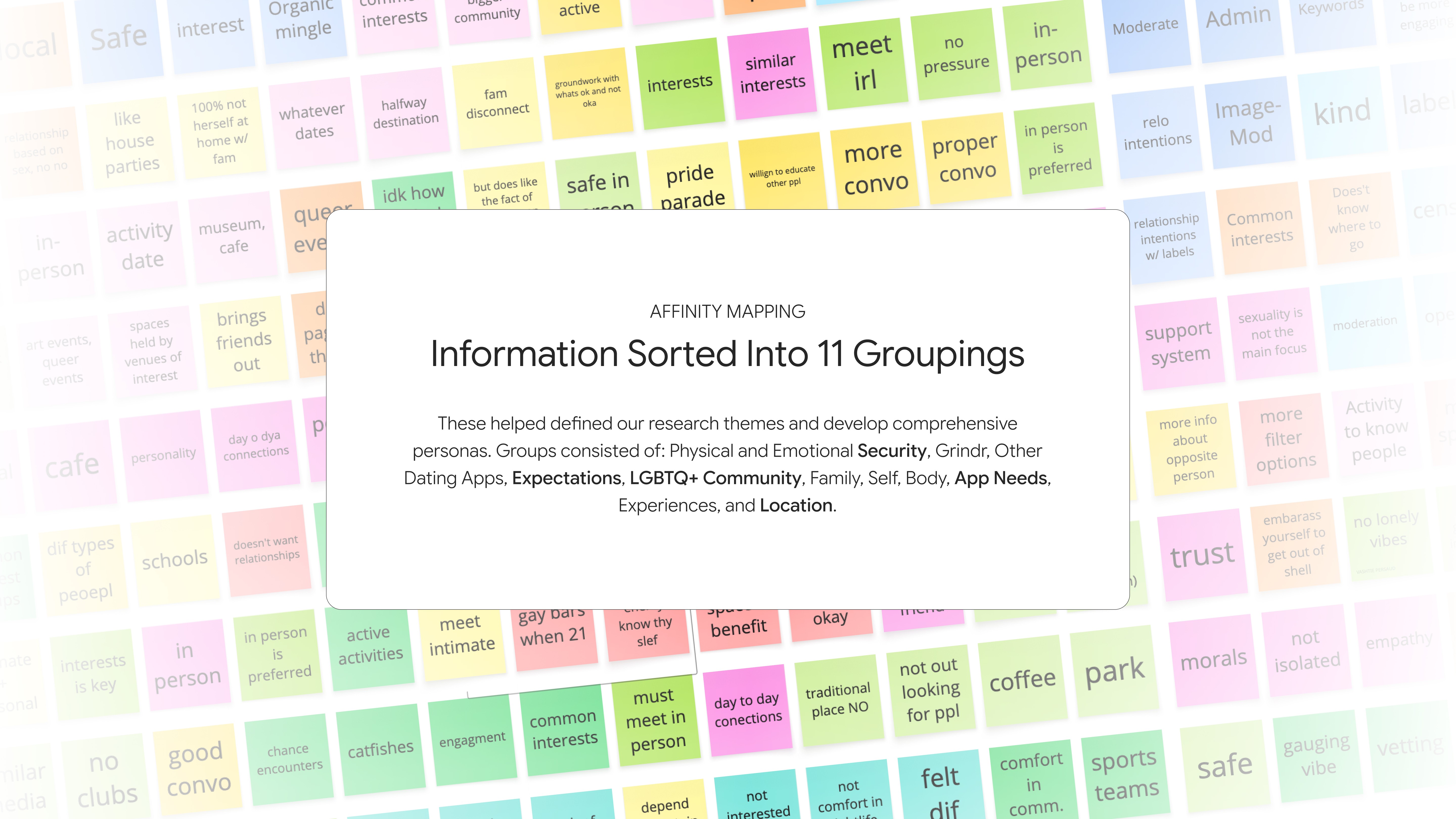 Affinity Mapping was conducted based on the interviews. The interviewees aged 20-28 are a diverse racial and ethnic group with variation in gender identity and sexual orientation to capture Grindr's diverse audience.