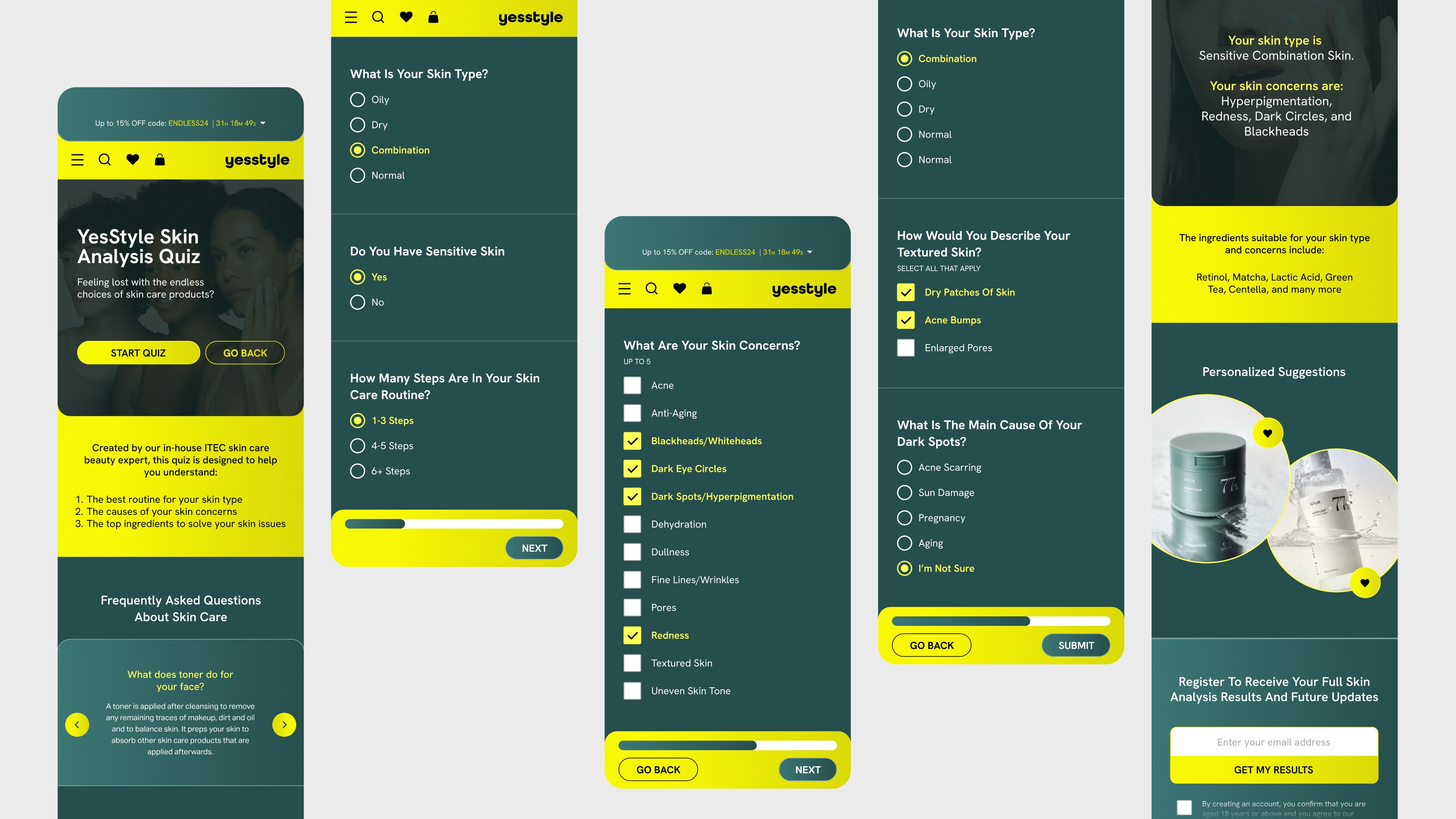 UI rebrand of the YesStyle e-commerce site to enhance brand consistency and improve user navigation. Introducing a new design system and emphasizing a personalized “skin analysis quiz” feature.